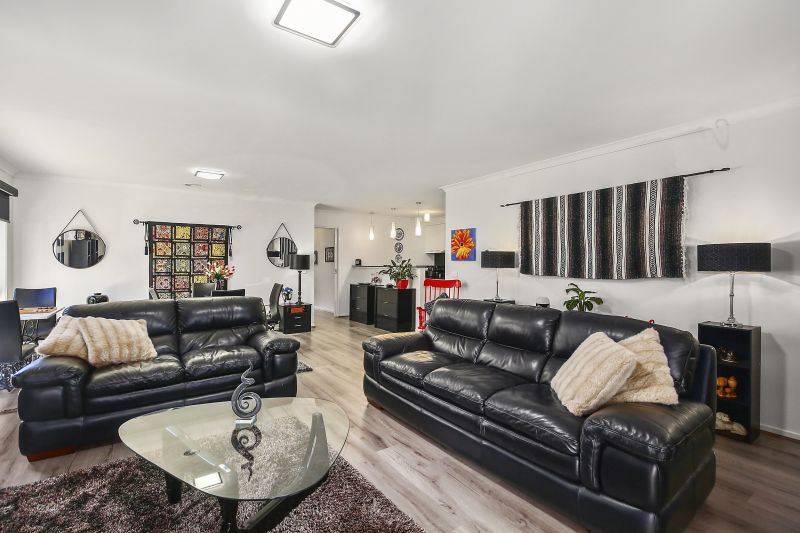 This modern house speaks for itself; boasting four spacious bedrooms, all with built in robes & main bedroom with walk in robe & en-suite. The kitchen has modern stainless-steel appliances throughout & overlooks the large open plan living & dining area. From the living area you have access outside to the undercover alfresco for all of your entertaining needs.