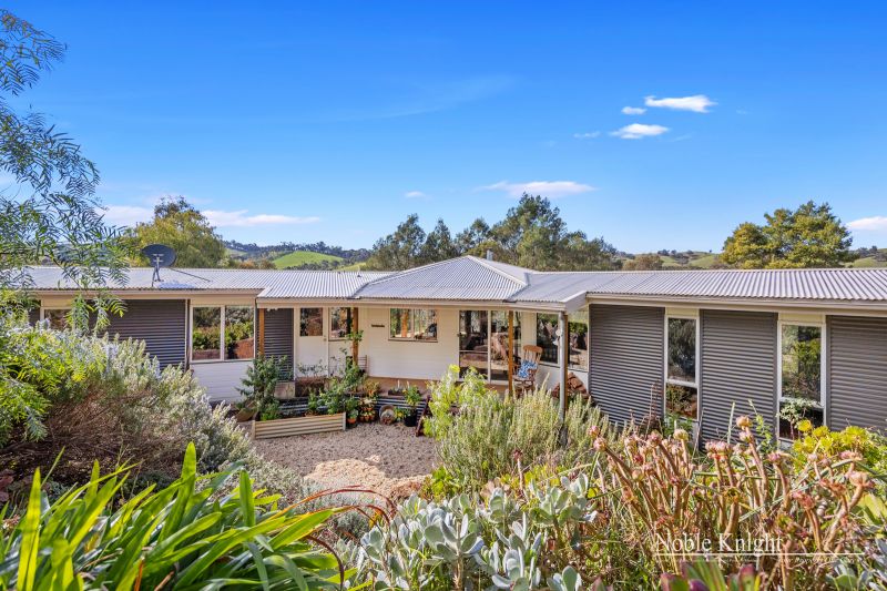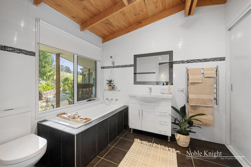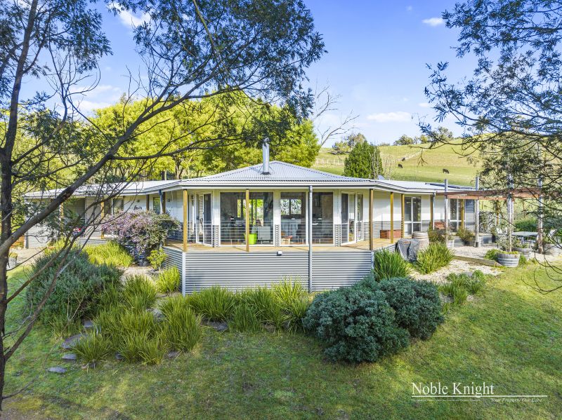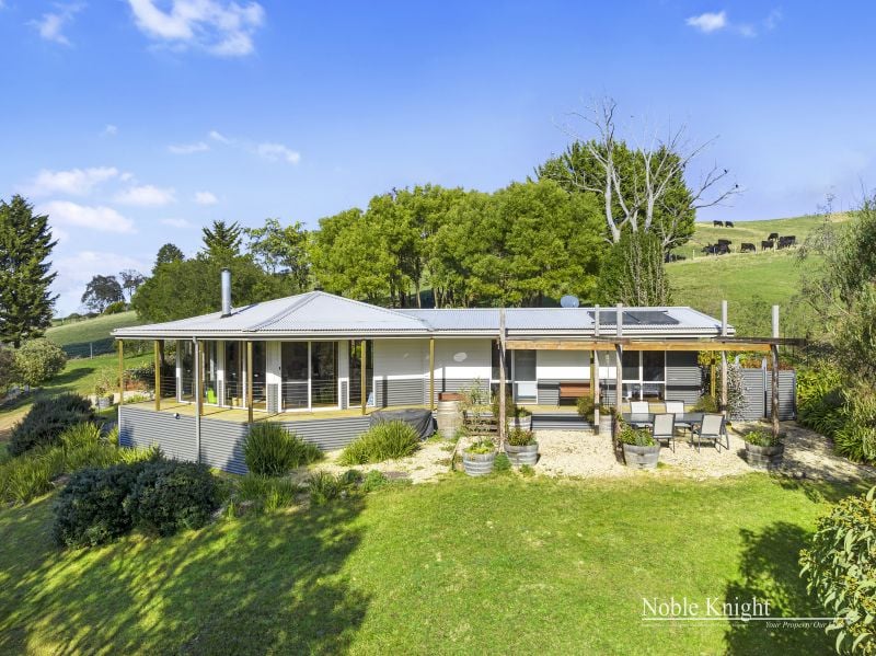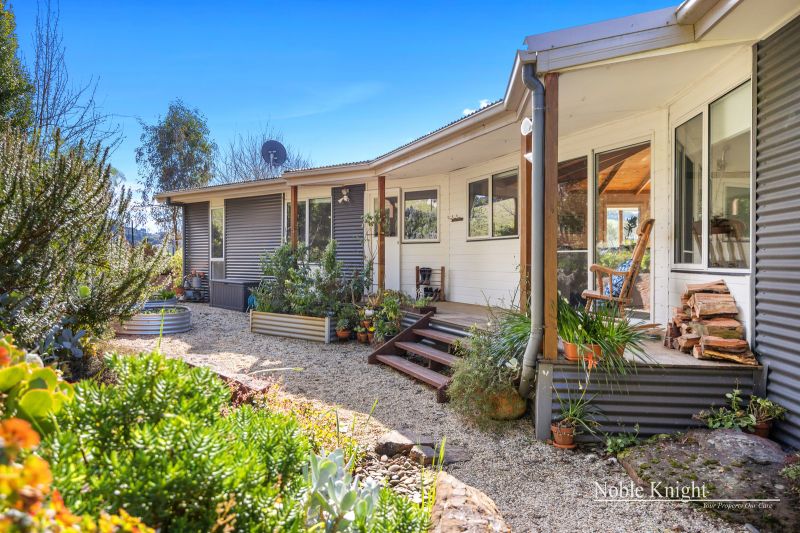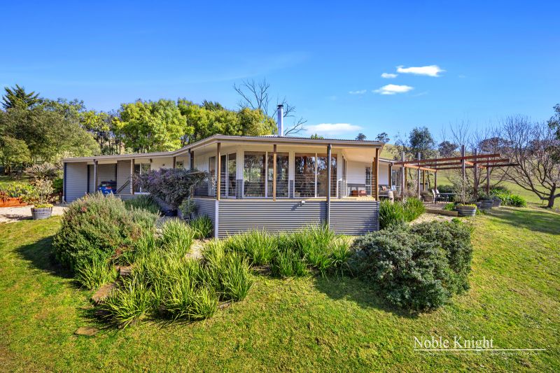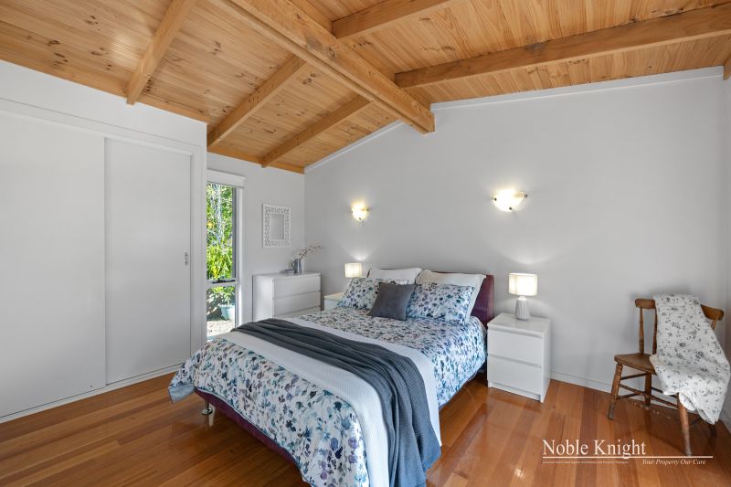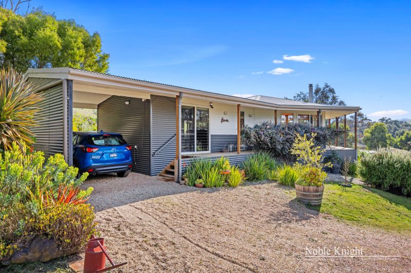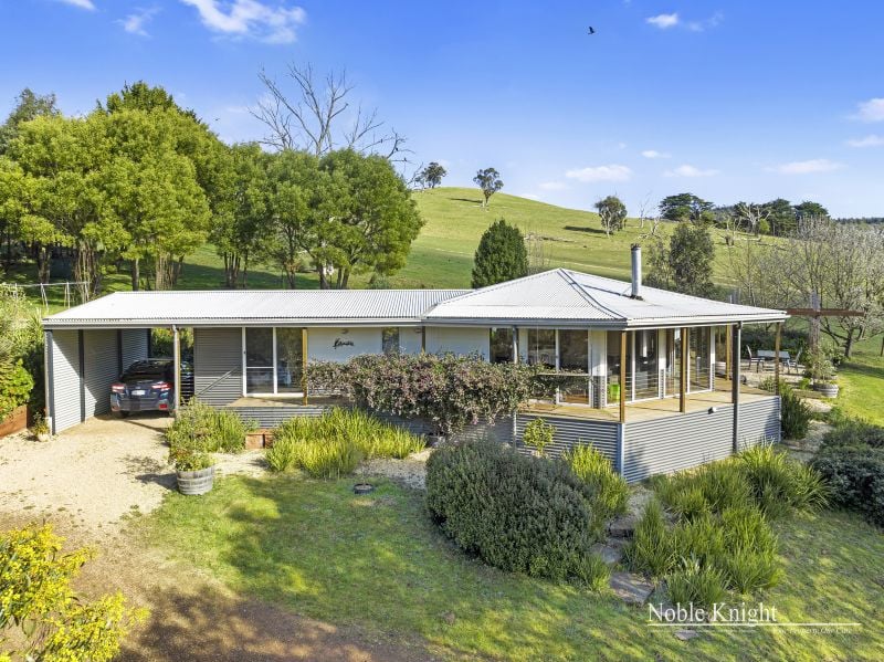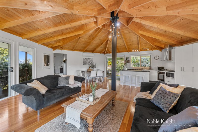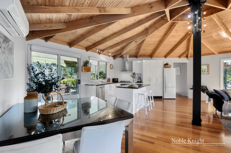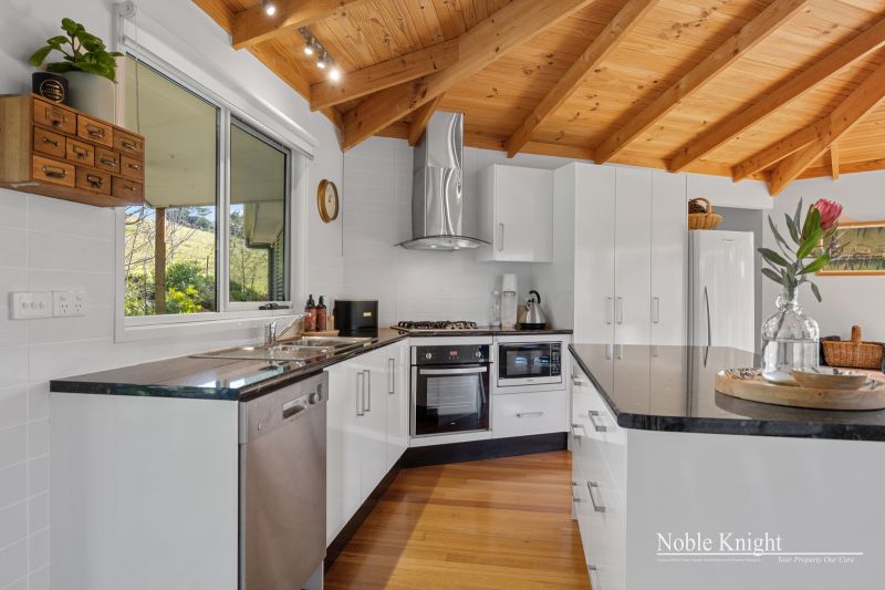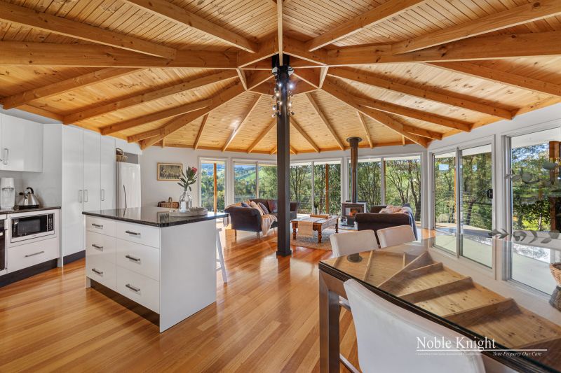 Perched slightly elevated, the residence showcases a captivating blend of colorbond steel and hardie-plank boards, resulting in a truly distinctive architectural marvel. Venture inside to discover an open-plan living space, adorned with polished hardwood floors and a comforting wood heater, creating an inviting atmosphere for cozy evenings. The vaulted pine-lined ceiling, accentuated by exposed beams, draws the eye upward, while full-height picture windows steal the show, framing ever-changing views like living canvases.