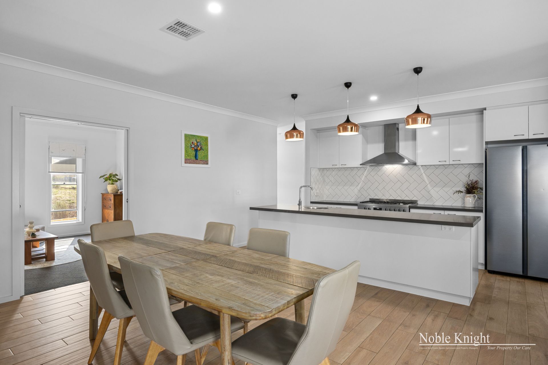 As you step inside, you're greeted by an inviting open-plan living space, seamlessly blending modern design with the comforts of home. The kitchen boasts sleek cabinetry, stone tops, stainless steel appliances, and a generous island, perfect for entertaining or family meals.