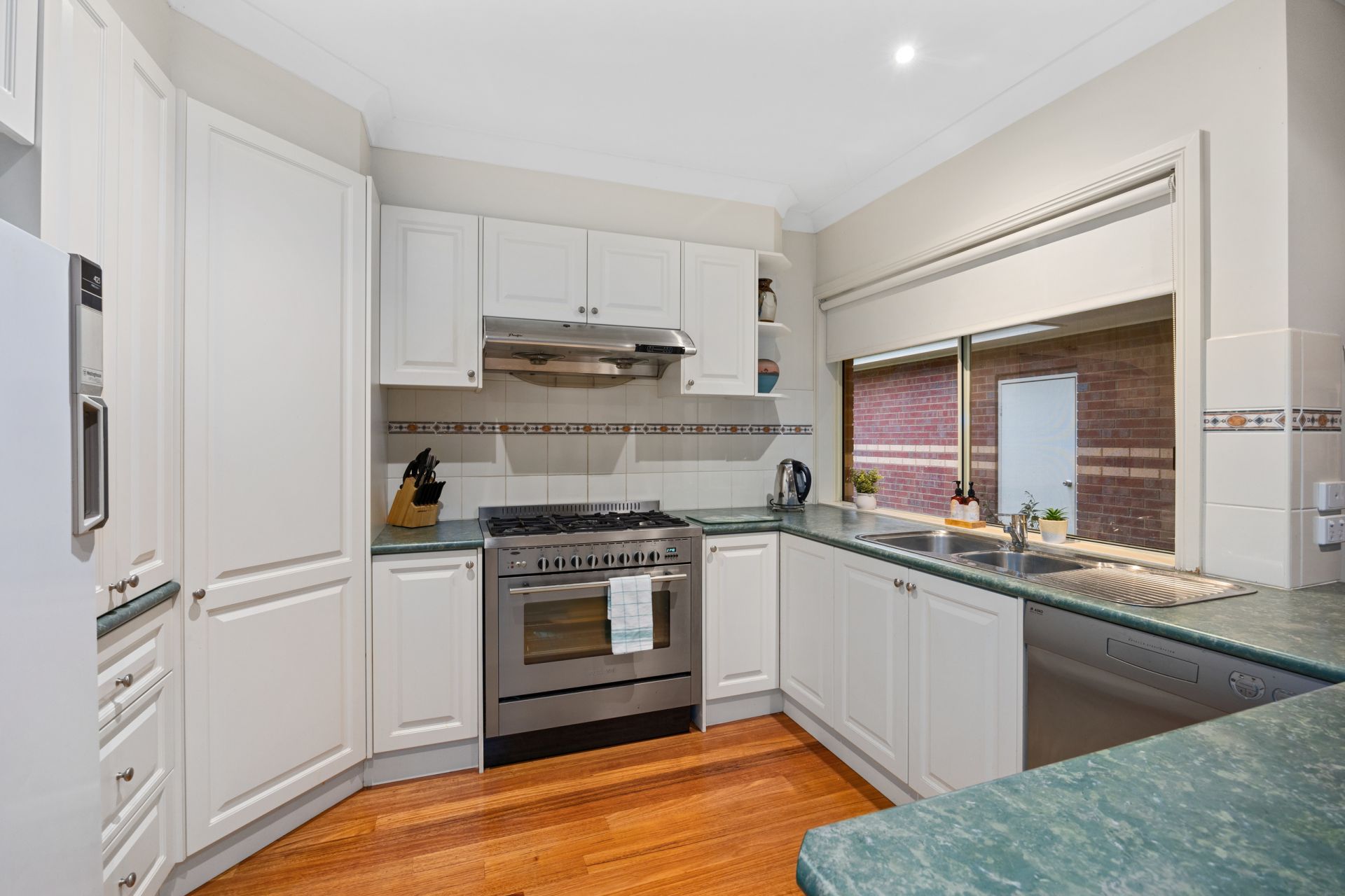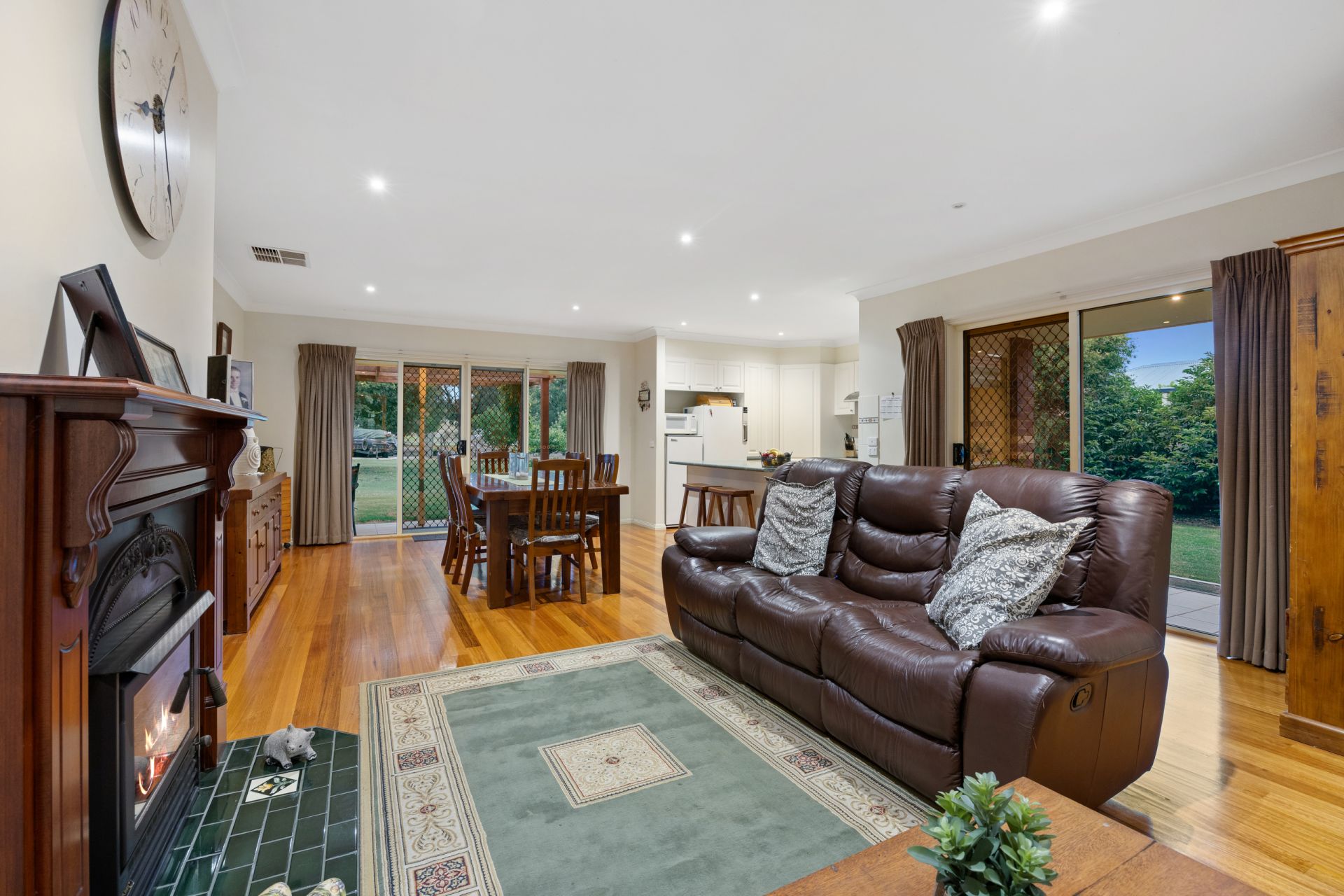 The heart of the home is its light-filled open-plan living area, featuring a cozy wood fire for winter evenings and evaporative cooling to keep you cool in summer. The well equipped kitchen, dining, and lounge areas flow seamlessly, providing ample space for family gatherings and entertaining.