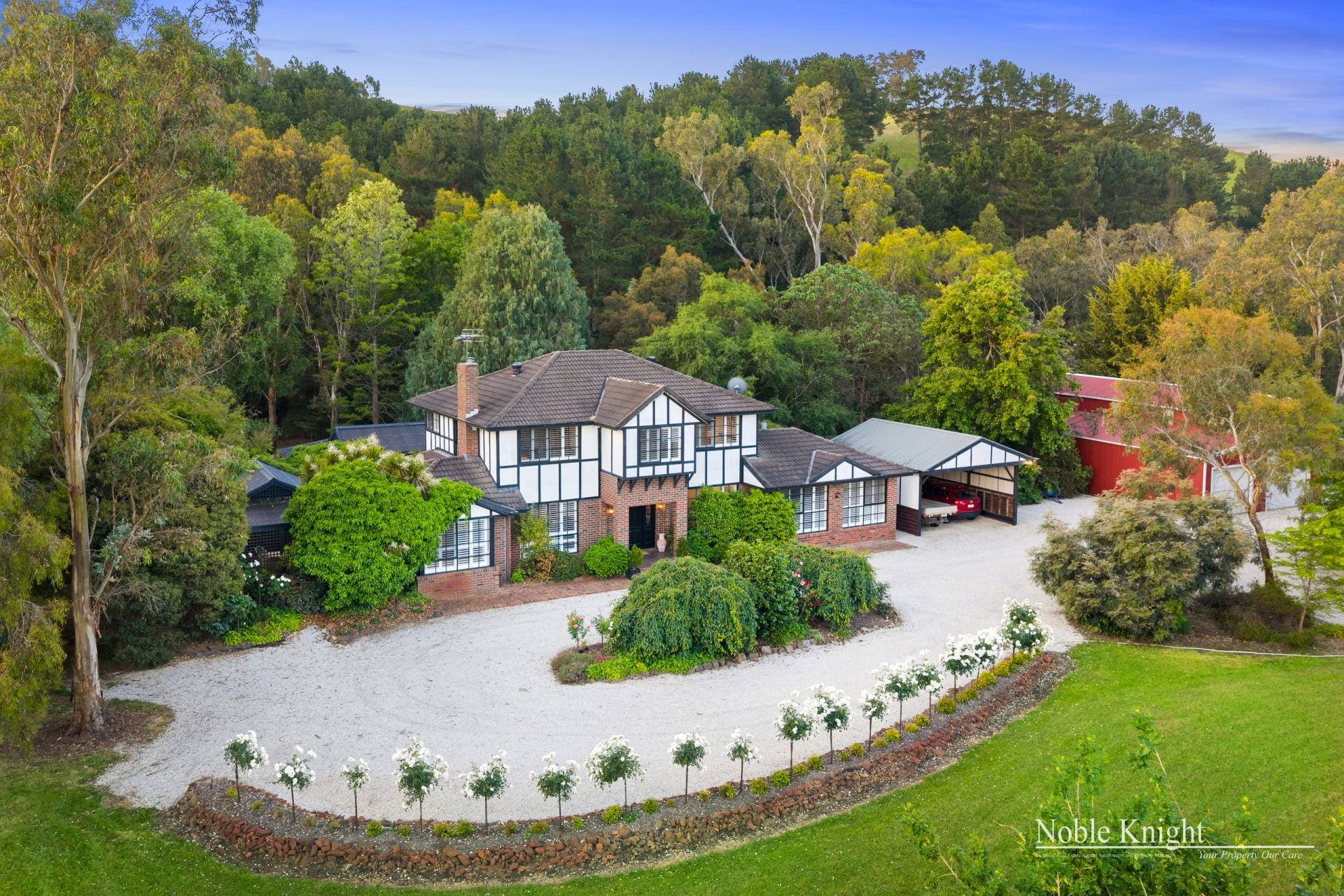 The home is surrounded by stunning gardens that frame the property beautifully and create a peaceful, picturesque setting.