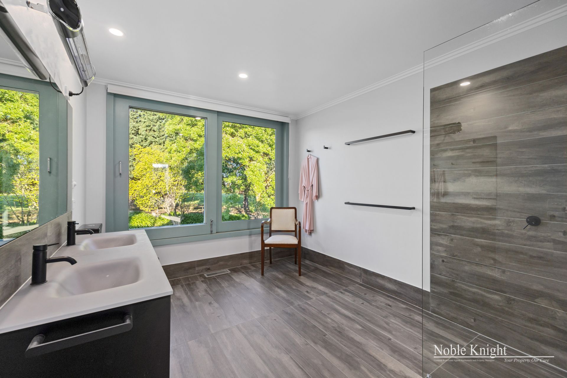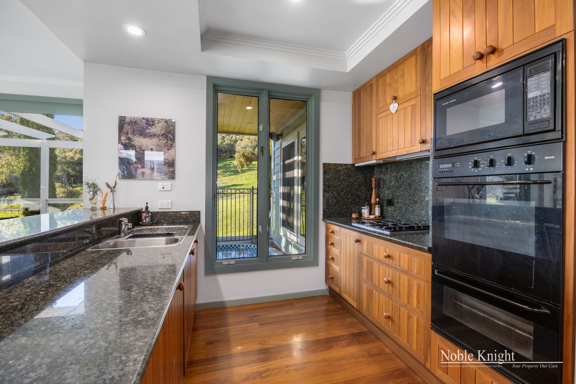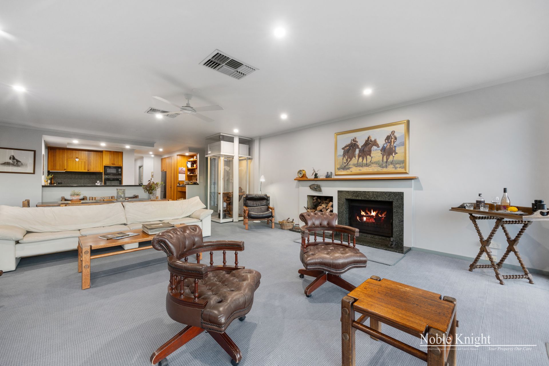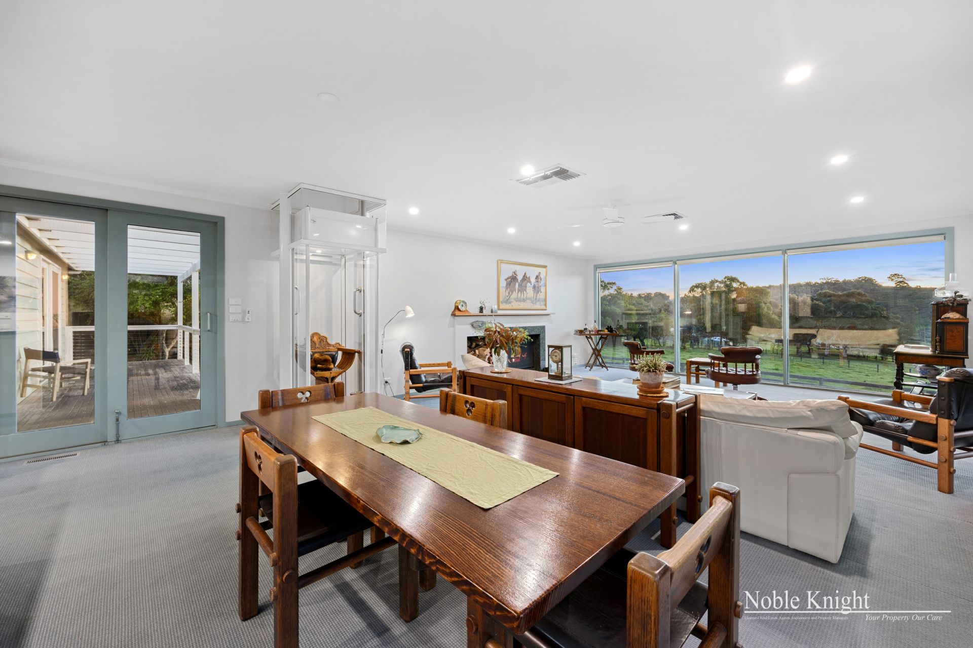 The two-story home, with its charming storybook façade, boasts 9ft ceilings and a resi lift, making it both elegant and functional. Inside, you'll find an expansive open-plan living area featuring large windows that flood the space with natural light and frame the sweeping views of the property. The kitchen is a chef's dream, with Tasmanian Brush Box cabinetry, granite benchtops, and gas cooking, flowing effortlessly into the dining and living spaces.