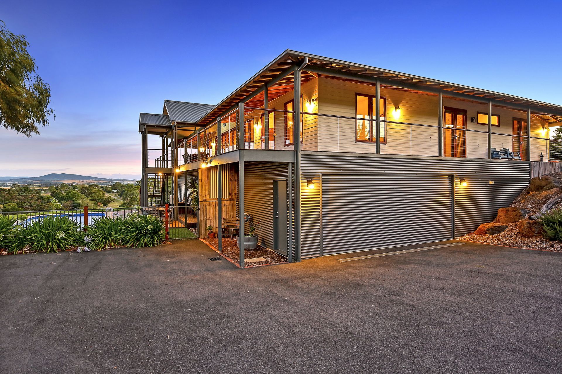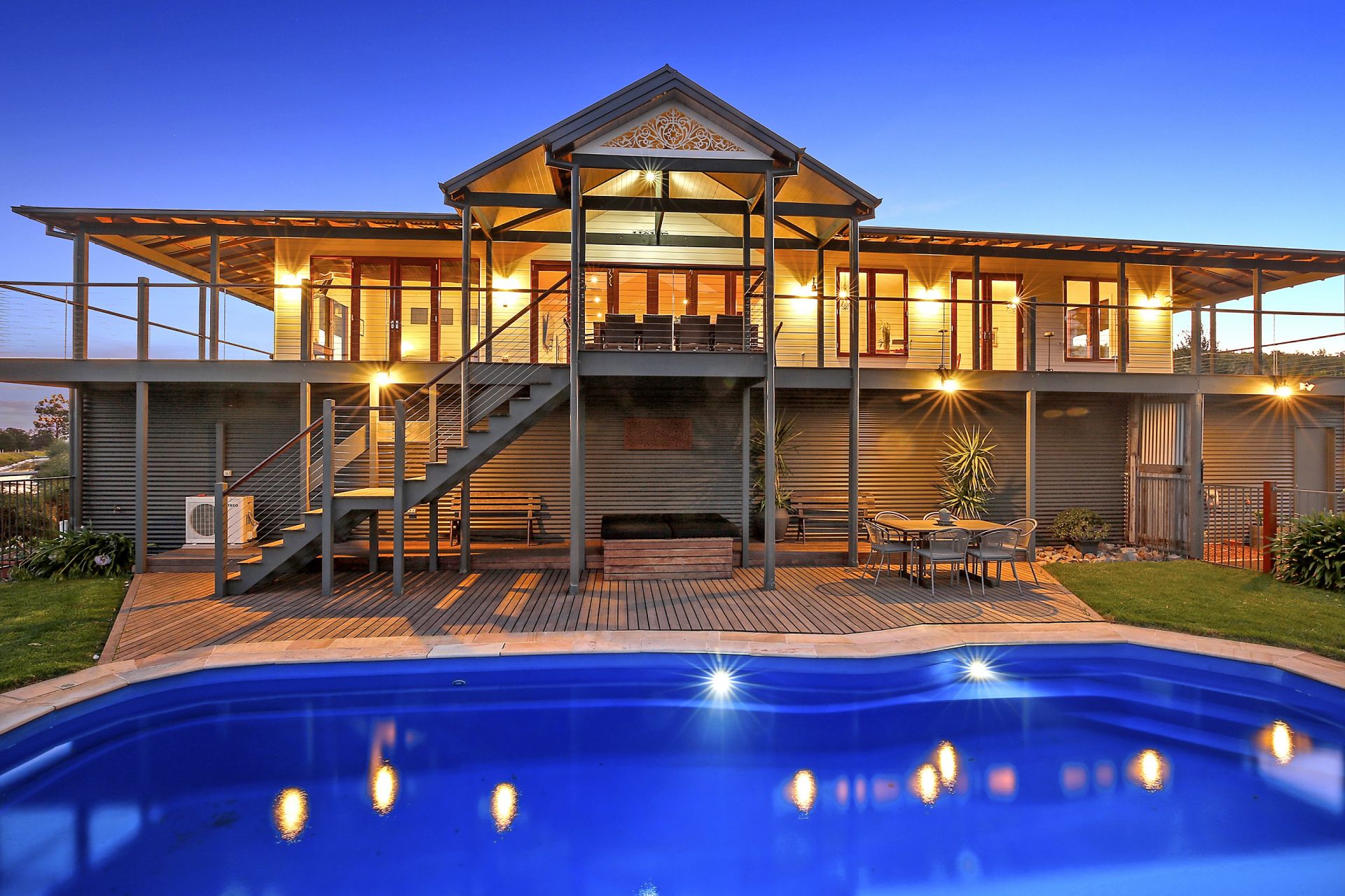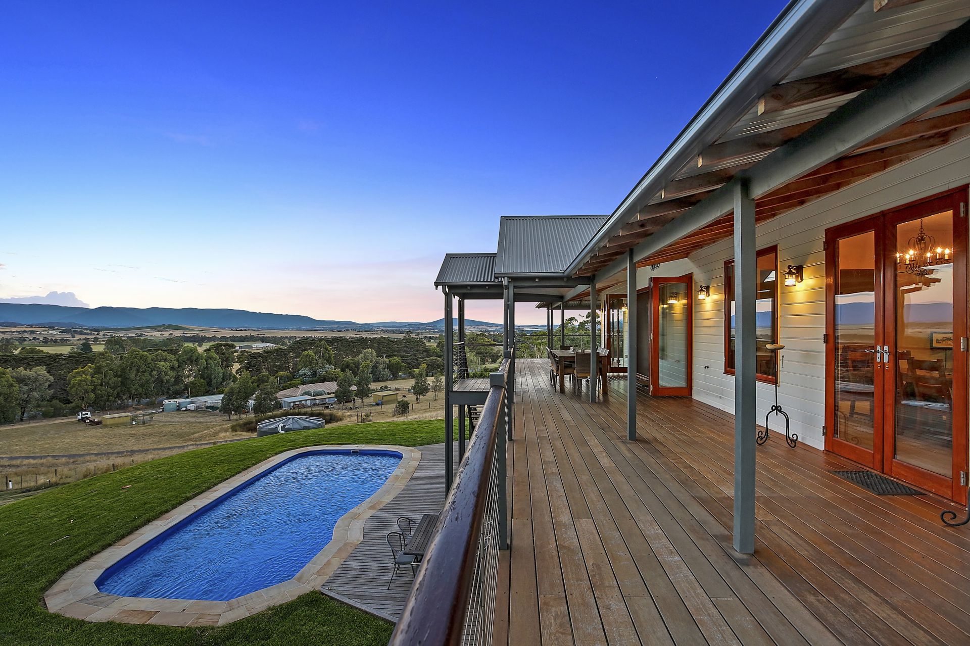 Leading from the sealed driveway, oozing with elegance and class proudly stands this flawlessly presented Queenslander inspired home offering a luxurious lifestyle. With ample space for indoor and outdoor entertainment, from having a quite champagne on the wrap around balcony to swimming in the glistening in-ground pool. From walking through the house the emphasis on space is immediately evident in the large family lounge and formal dining room, both with picturesque views. The Kitchen boasts stone bench tops, tiled splash backs, red gum island bench and a freestanding stainless steel gas oven. The large laundry is conveniently situated with outdoor access. The master bedroom offers total luxury with a spacious walk in robe and ensuite with a spa bathtub meticulously placed to capture the views of the valley. Additionally, the home has three sizeable bedrooms, all with built in robes, ceilings fans and two sharing an ensuite with a double vanity. Placed is a four car garage and workshop, bottom level offers a fifth bedroom with a walk-in robe + a sound proof home office and bathroom. Additional features of the property include, double glazed windows, Rosewood polished floorboards, plantation shutters, a sound system throughout the house, ducted vacuuming, gas ducted heating, refrigerated cooling. Connected to mains water and natural gas, 25,000 litre water tank and a large 9m x 12m Shed (Man Cave) with concrete floor and power. The land is fully fenced with three paddocks, easily manageable and located only a short drive to the township of Yarra Glen, if you are wanting a taste of luxury and elegance with a sense of country living.
